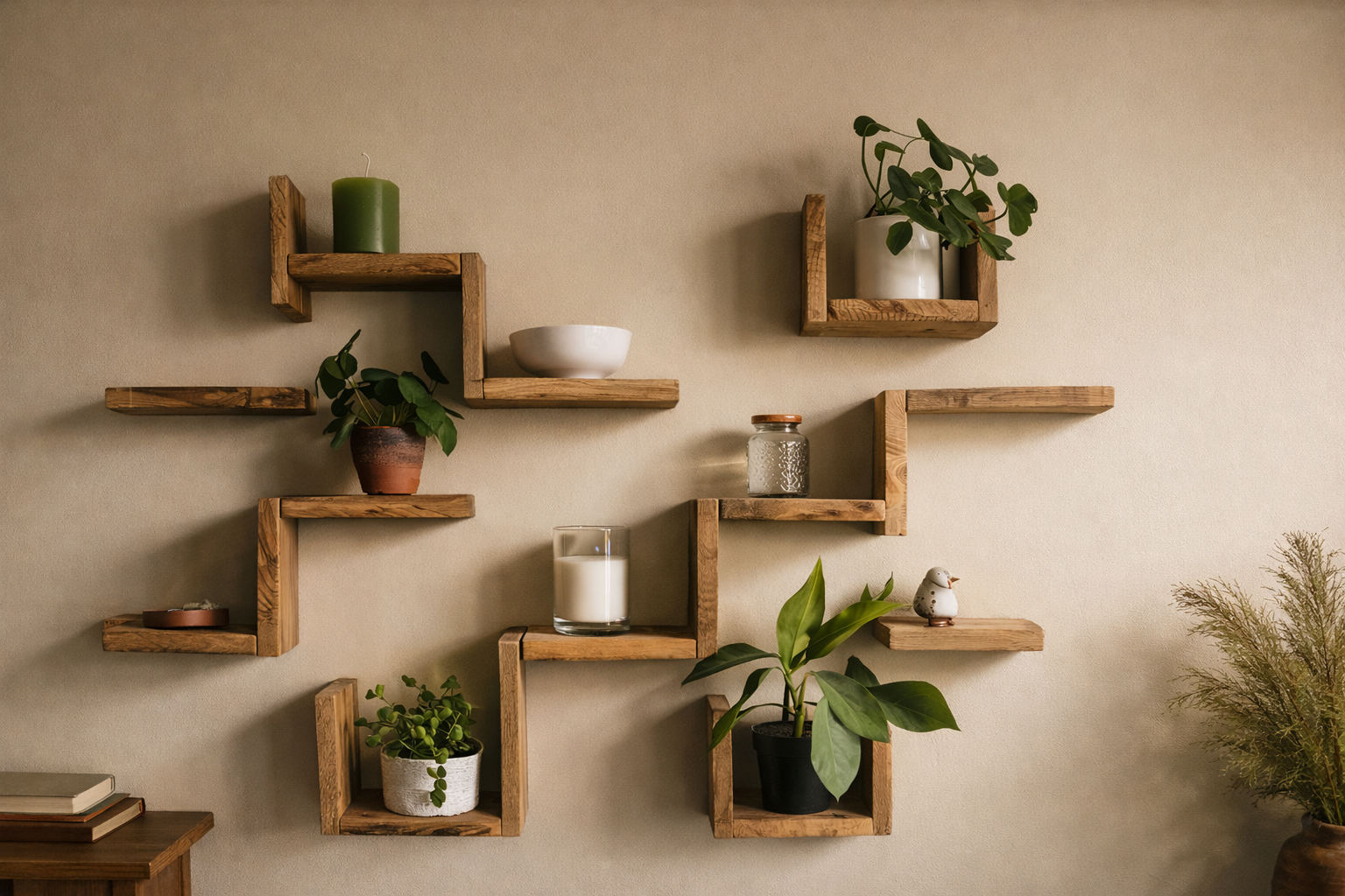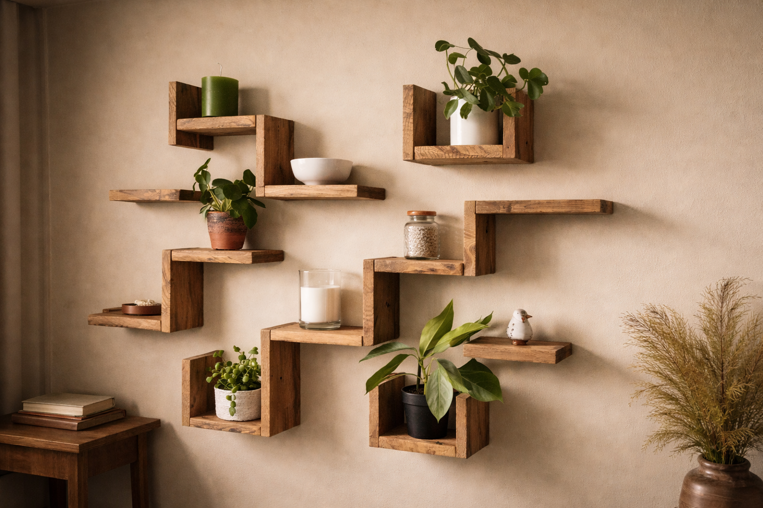 Duvara şık bir dokunuş katan modüler ahşap raf; doğal dokusu, temiz geometrisi ve sağlam yapısıyla bitkileriniz ve dekorlarınız için bir sergileme alanı sunar